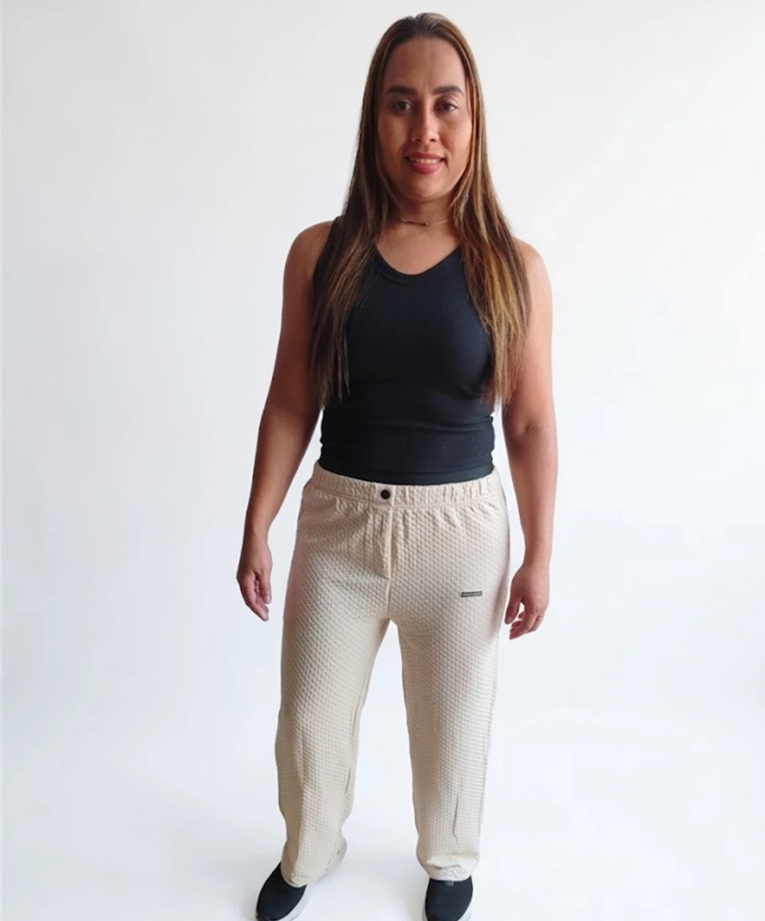 El pantalón es de corte recto en color crema o beige claro, destacando por su tejido con relieve (tipo waffle o piqué grueso).